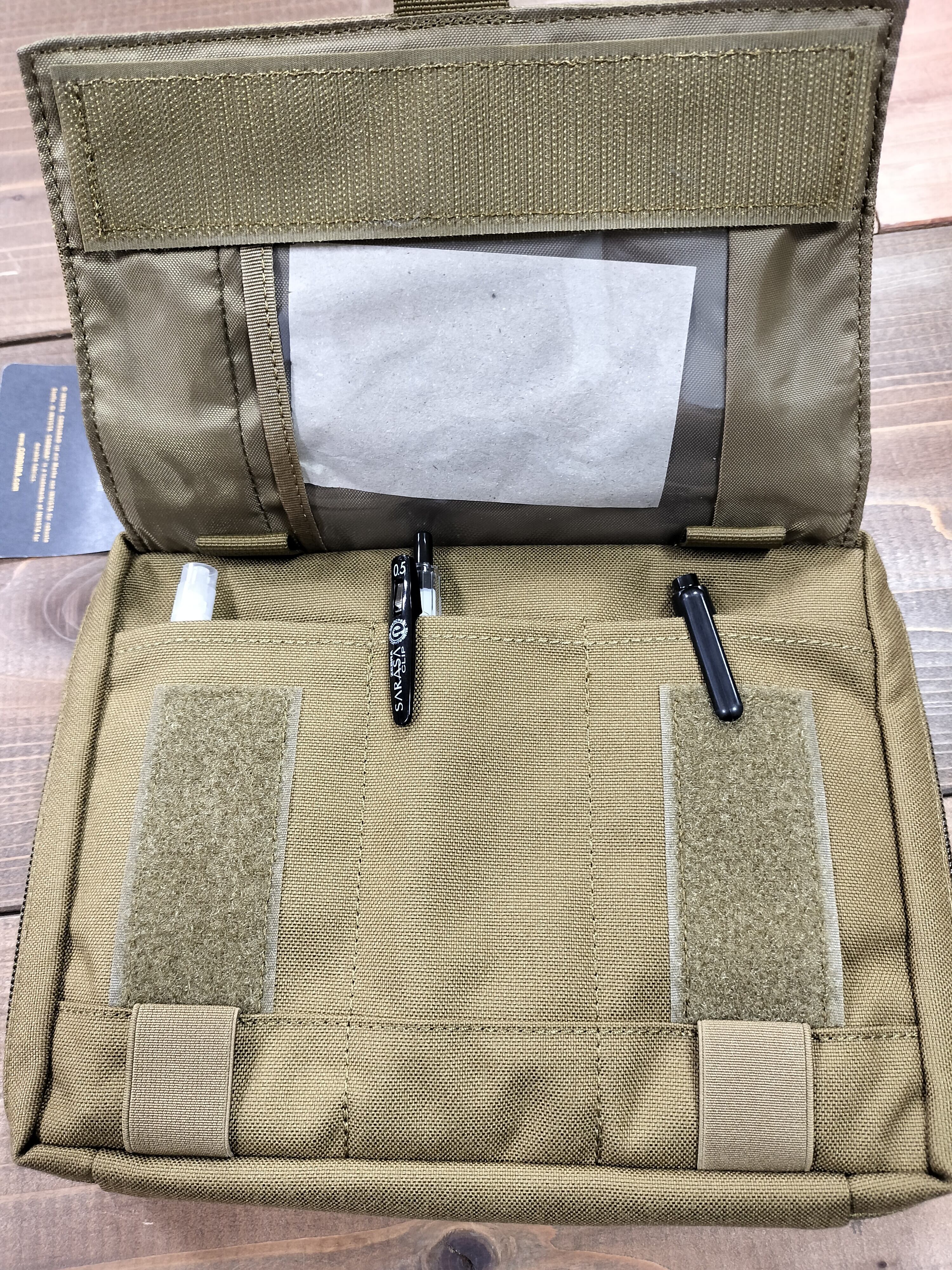 1.フラップ/外側にジッパーポケット、ベルクロベース(秘密のコイン用ポケット)/内側にペン差し、透明ポケット、ゴムループ